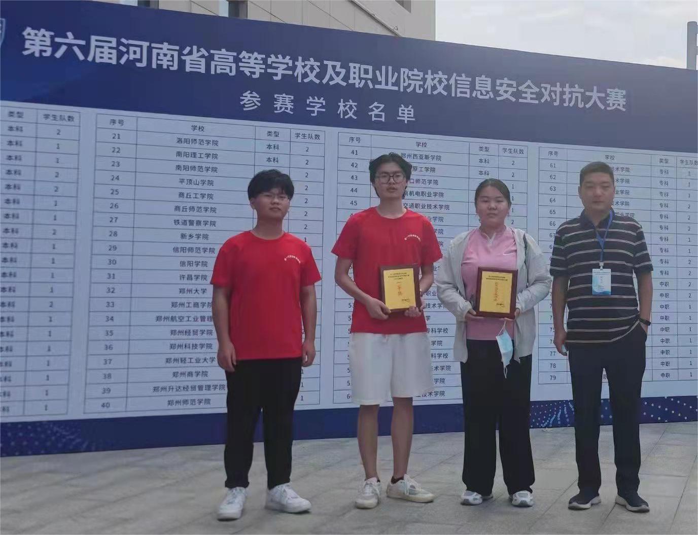 8月19日,由河南省教育廳主辦的“第六屆河南省本科高校及職業院校信息安全對抗大賽”圓滿落幕。我校計算機科學與技術專業學生鐵欣苗、臧家印、王開組隊參加比賽,經過激烈角逐,最終獲得本科組團體一等獎,鄭天明老師獲優秀指導教師獎。