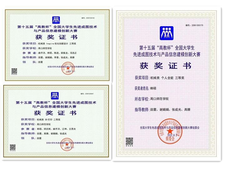 近日,第十“高教杯”全國大學生先進成圖技術與産品信息建模創新大賽成績揭曉我校機械與電氣工程學院學生韓碩師慶輝、曲平洋等榮獲機械類3D打印團體二等獎1項、輕量化設計團體三等獎1項、機械類個人全能三等1項。