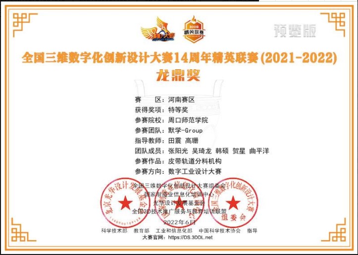 6月1日,全國三維數字化創新設計大賽精英聯賽河南省賽區賽區成績公布。由機械與電氣工程學院田震博士、高珊老師指導,張陽光、吳琦龍、韓碩、賀星和曲平洋等五名學生完成的作品“皮帶軌道分料機構”獲得河南省賽區特等獎,并将進入7月份舉辦的全國總決賽。本次大賽充分展現了我校學子“數字技術+創新文化+工匠精神”融合發展能力,是我校“以賽促教、以賽促學、以賽促用、以賽促新”教學模式探索,深化教育教學改革,提高人才培養質量的重要體現。