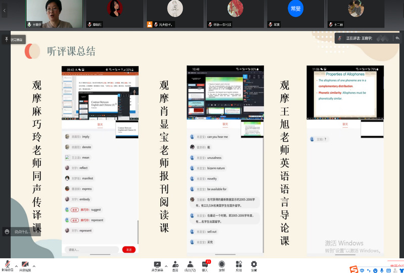 會上,翻譯教研室麻巧玲老師評議了本教研室《英語口譯》課,高級英語教研室王二麗老師分享了本教研室線上教學互動方法,語言文化教研室王曉宇老師提出思政元素的融入要使學生在情感上産生共鳴,才能達成思政育人目标。大學英語第四教研室常婧老師展示了POA(産出導向法)教學理論的運用,黃娟老師提出應當通過研讨、集體備課、會診評課,高質量達成課程目标。